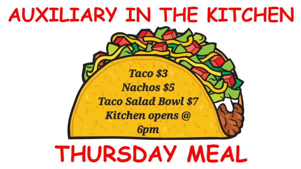 Thursday meals are provided by volunteers. Though very rare, situations arise and a planned meal may not be able to be provided. We do our best to provide accurate information on the upcoming meals. Meal information can also be obtained by visiting the post or calling the post at 419-288-3634.